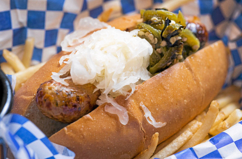 SERVED WITH SAUERKRAUT AND GRILLED PEPPERS.